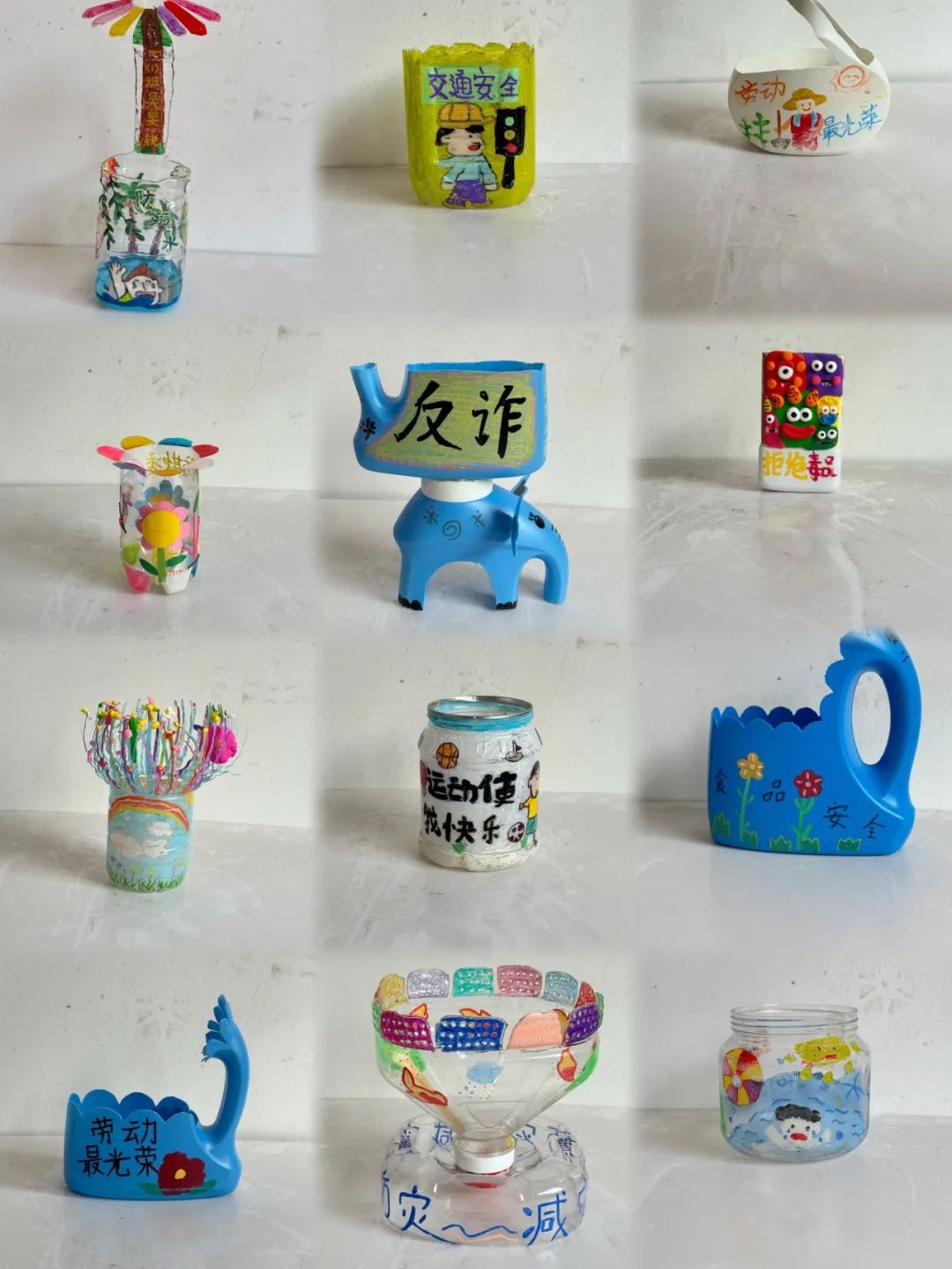 活動準備期間,致和小學各班級依托綜合實踐課,鼓勵同學們充分發揮想象力和創造力,利用塑料瓶、易拉罐等廢棄物品制作創意花瓶。孩子們積極響應,用一雙雙巧手將廢舊物品變“廢”為寶,制作出一件件精美的手工作品,每一件作品都蘊含著他們對環保的獨特理解和深刻感悟,每一處細節都藏著對綠色生態的熱愛。