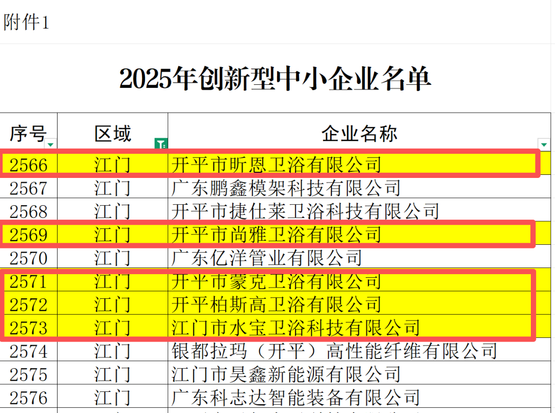 日前,廣東省工業和信息化廳公布了2025年創新型中小企業和通過復核的創新型中小企業名單,水口鎮5家企業新入選省創新型中小企業名單,分別為:開平市昕恩衛浴有限公司、開平市尚雅衛浴有限公司、開平市蒙克衛浴有限公司、開平柏斯高衛浴有限公司、江門市水寶衛浴科技有限公司。