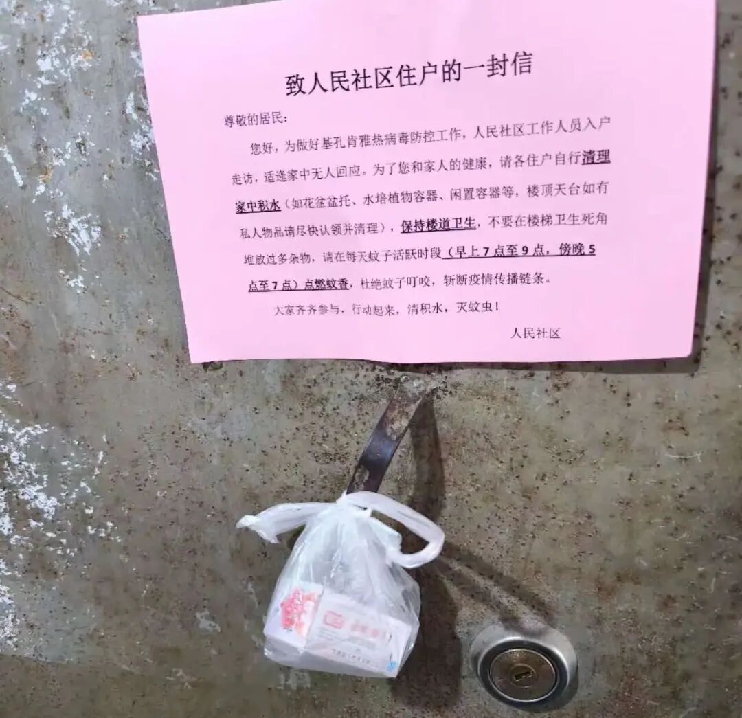 人民社區是轄區中心區域,居民以外出工作人員和上班族居多,白天時間許多家庭都沒人在家,若等到晚上再派發蚊香則錯過滅蚊的“黃金時間”。為此,社區干部精心準備了“防蚊家庭健康包”,內含滅蚊片、蚊香、防蚊液以及宣傳冊子、使用說明等物品,如在掃樓入戶期間,該戶無人響應,社區干部就把“防蚊家庭健康包”掛在門把手上,并附上通知書,號召住戶齊齊參與點滅蚊片、蚊香活動。人民社區負責同志表示:“行動效果非常好,一些住戶下班回家之后,看到門上掛著的‘防蚊家庭健康包’,主動致電給居委會詢問,并表示將配合社區工作。”截至目前,人民社區已累計制作并發放健康包200多個,形成了干群同心、群防群治的生動局面。