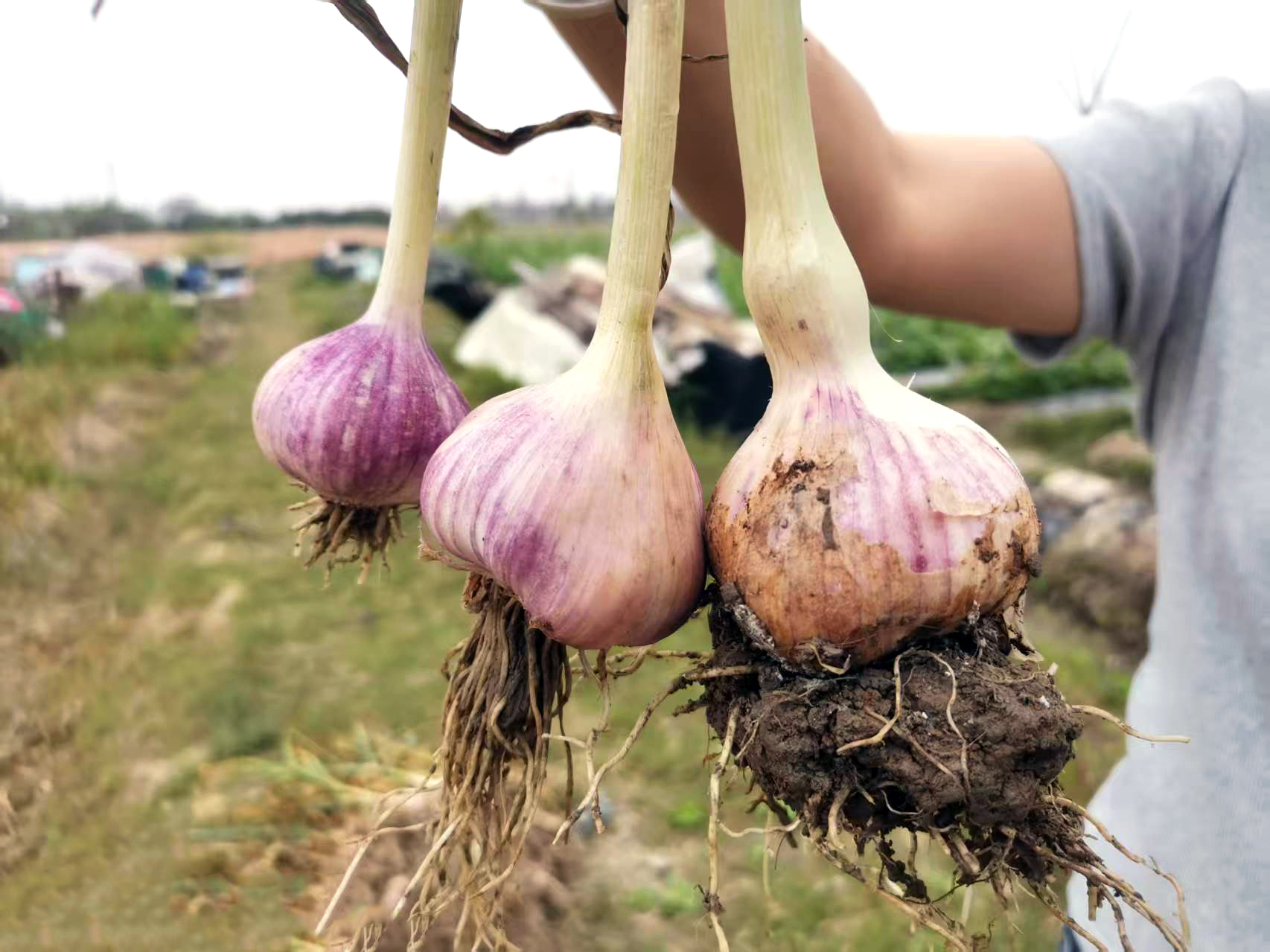 近日正忙著采收。只見張文波和種植戶們熟練地蒜頭部分表皮剝去,切去蒜根,留下約8寸的蒜梗,用稻草捆扎成束,隨后鋪放在陽光下或者陰涼處晾干數日,蒸發部分水分,便于后續翻曬熏烘和儲藏。