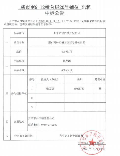 水口鎮新市南9-12幢首層20號鋪位出租中標公告