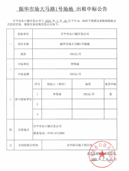 振華市場大馬路1號場地出租中標公告