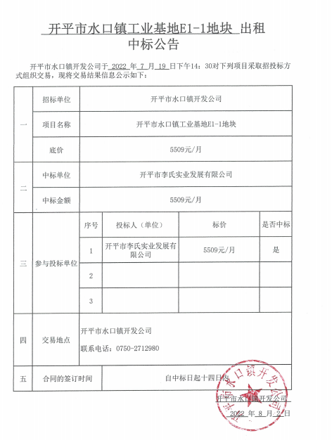 開平市水口鎮工業基地E1-1地塊出租中標公告