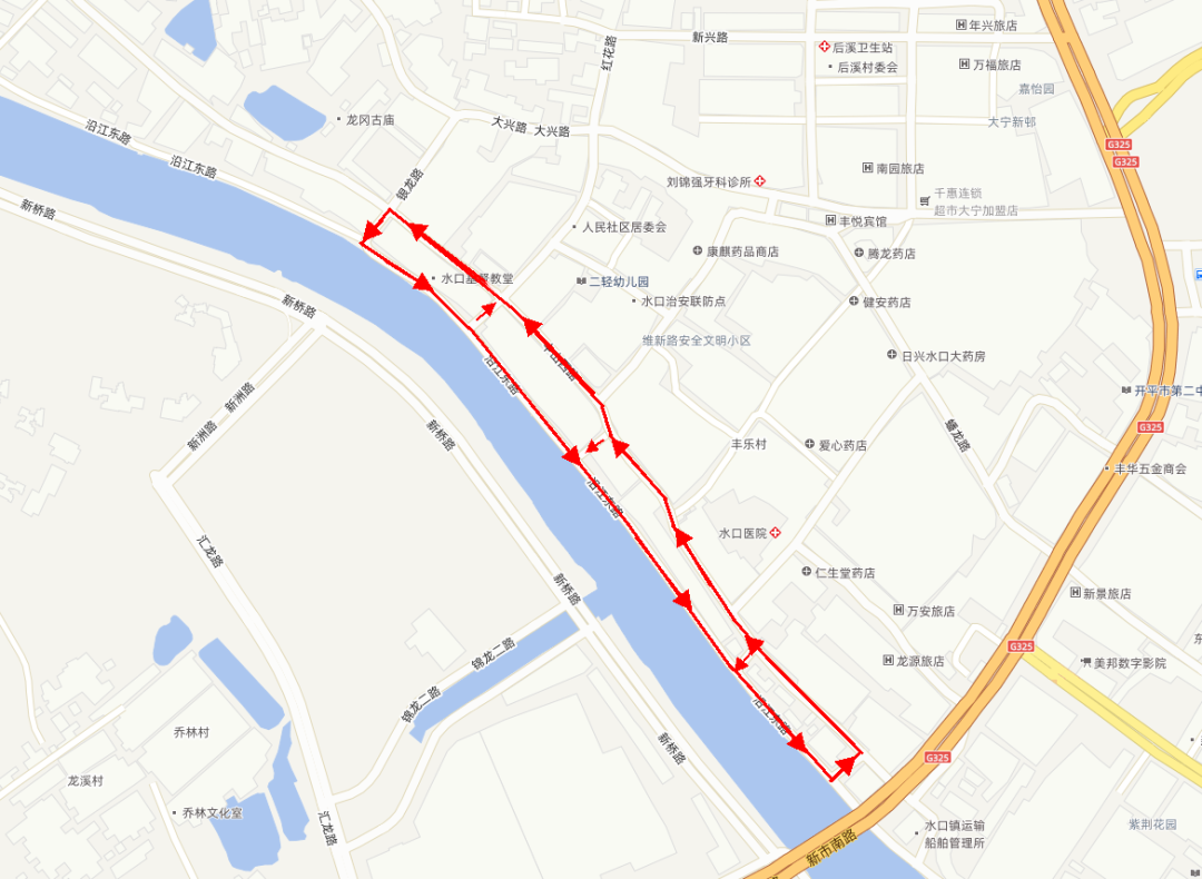 駛入水口鎮中山路、沿江路限行區域的車輛,必須按照路線示意圖和現場交通標志單向通行。限行區域之外的周邊通行道路允許車輛正常雙向通行,但進入管制路段后必須遵守單向通行管理。