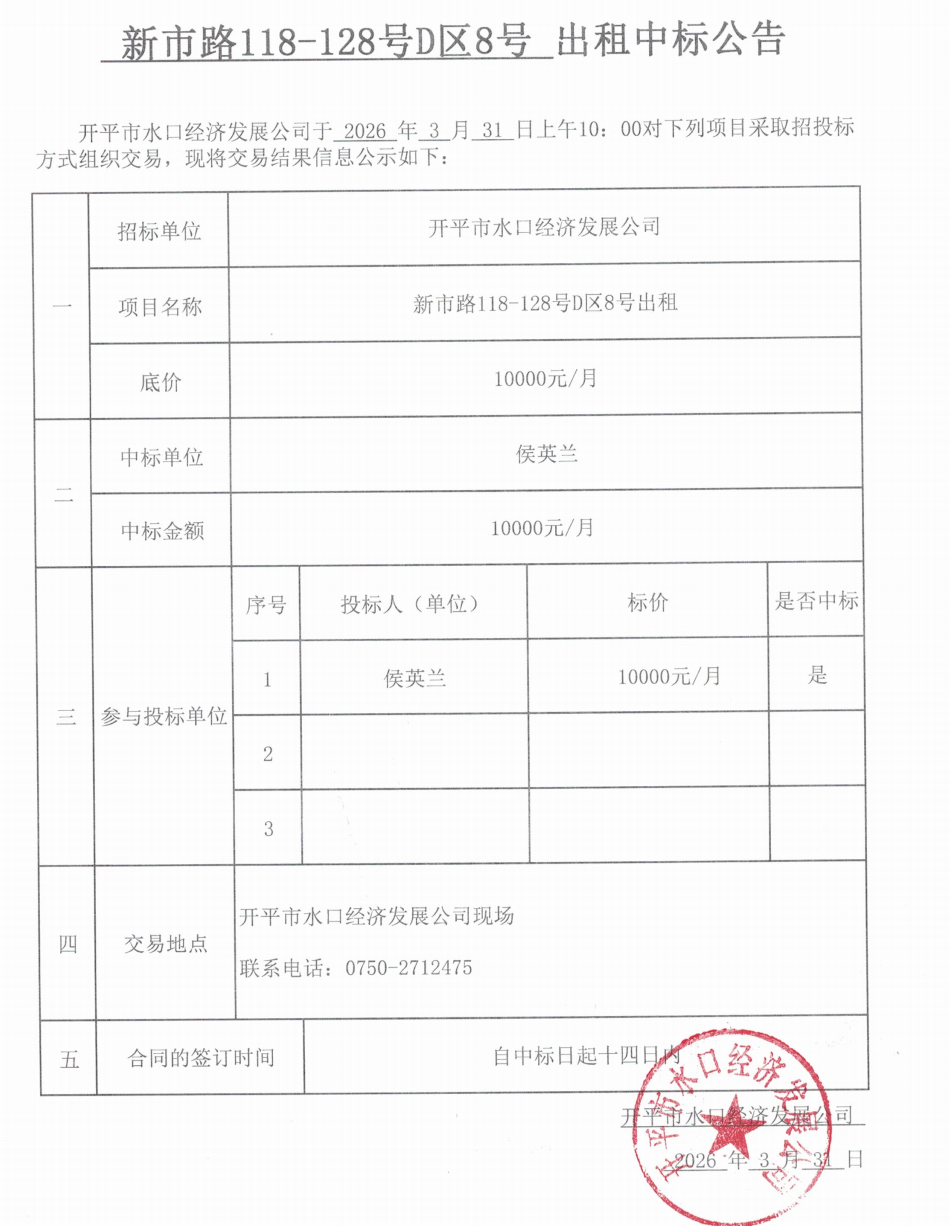 開平市水口經濟發展公司于2026年3月31日上午10:00對下列項目采取招投標方式組織交易,現將交易結果信息公示如下: