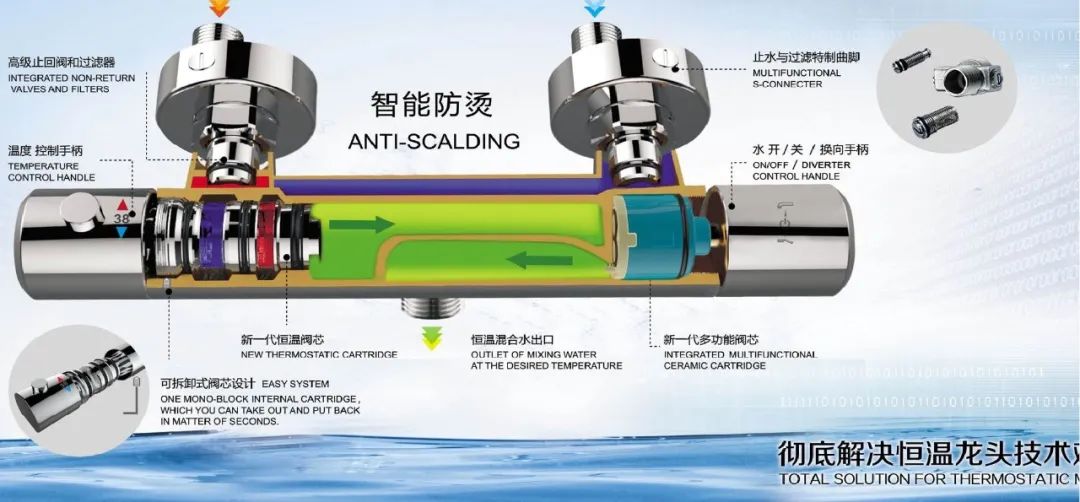 可拆卸式恒溫閥芯設計,使用行業內最好的靈敏感應原件,確保閥芯可以長時間使用而沒有后顧之憂。