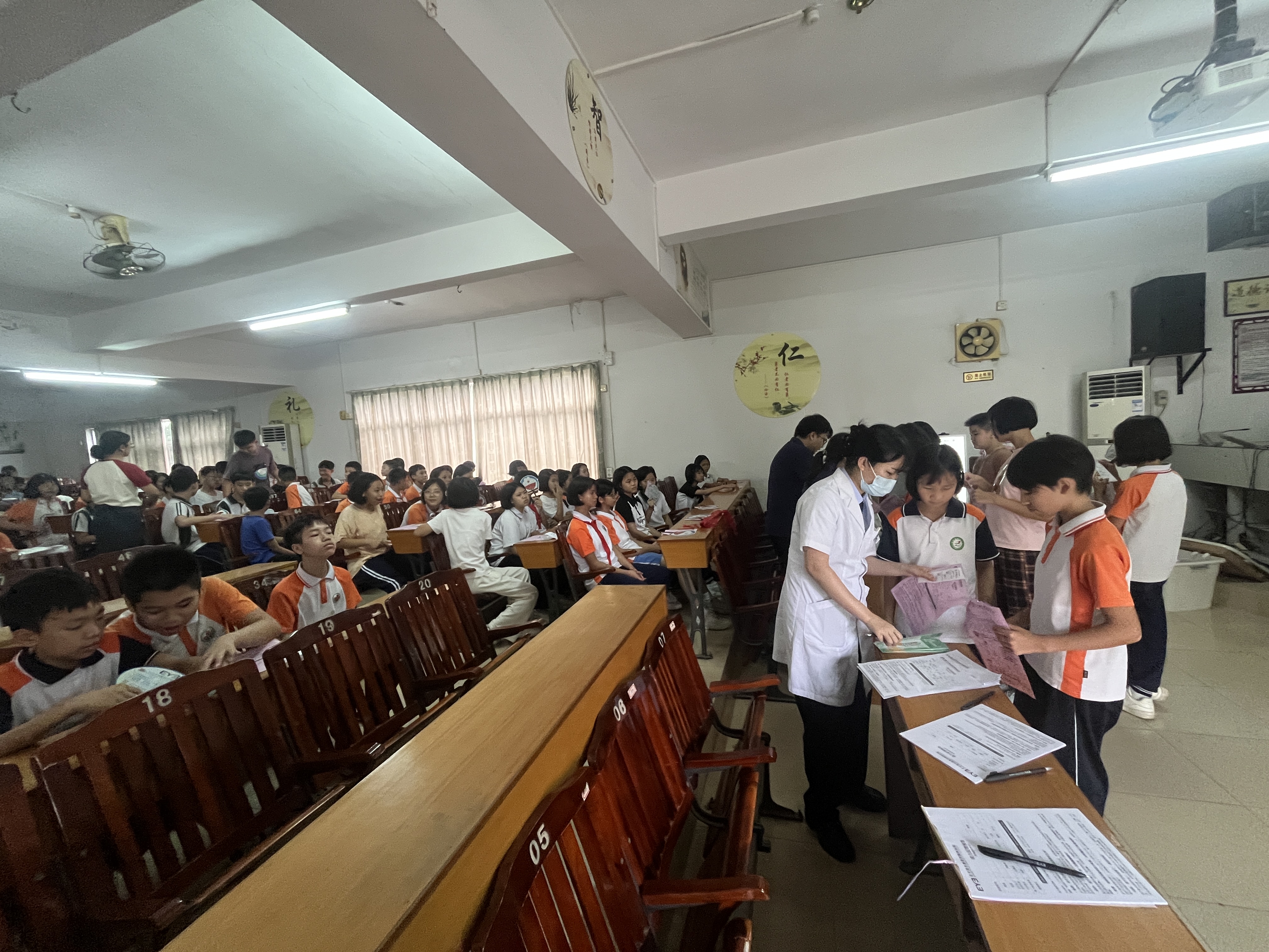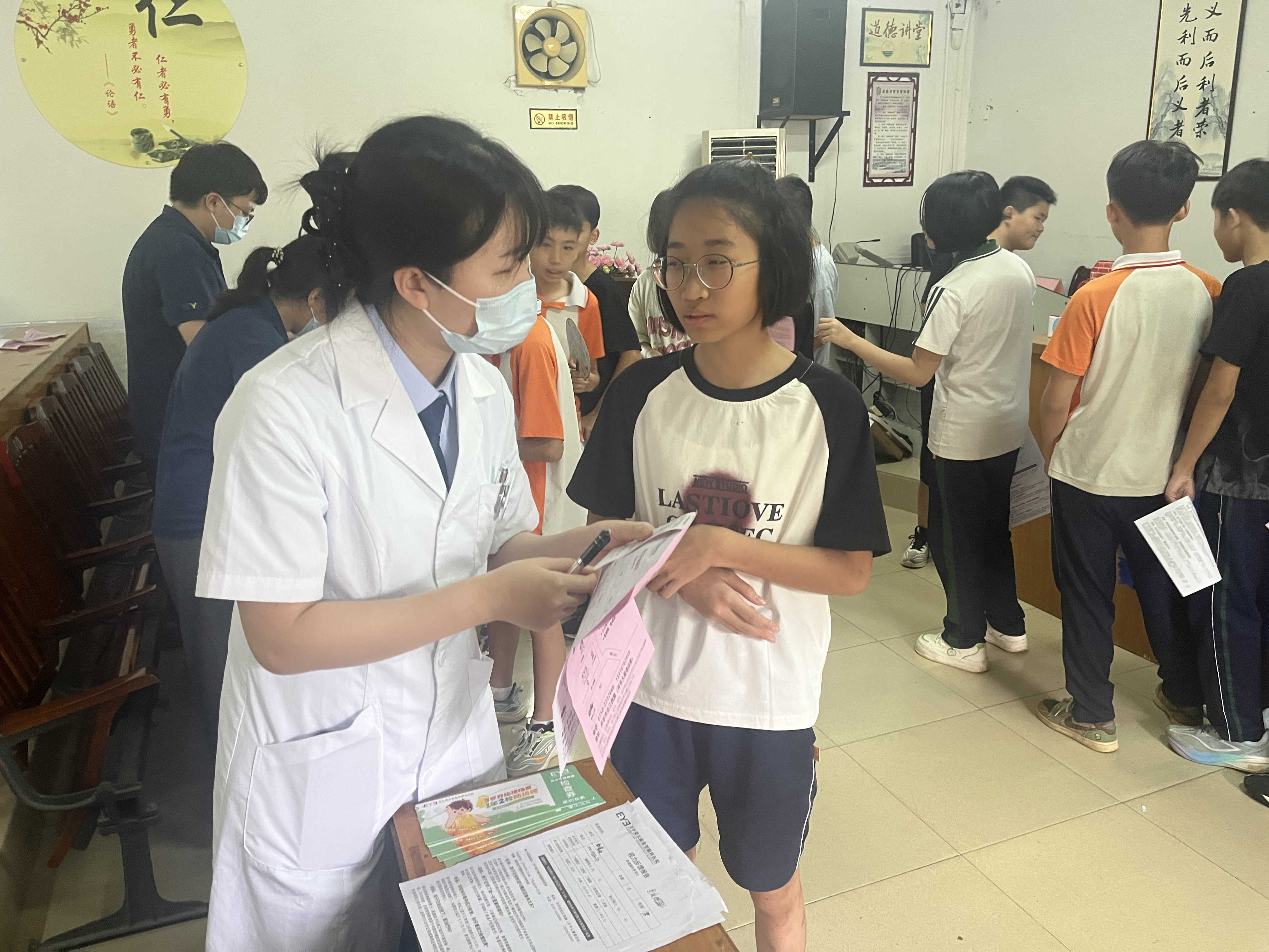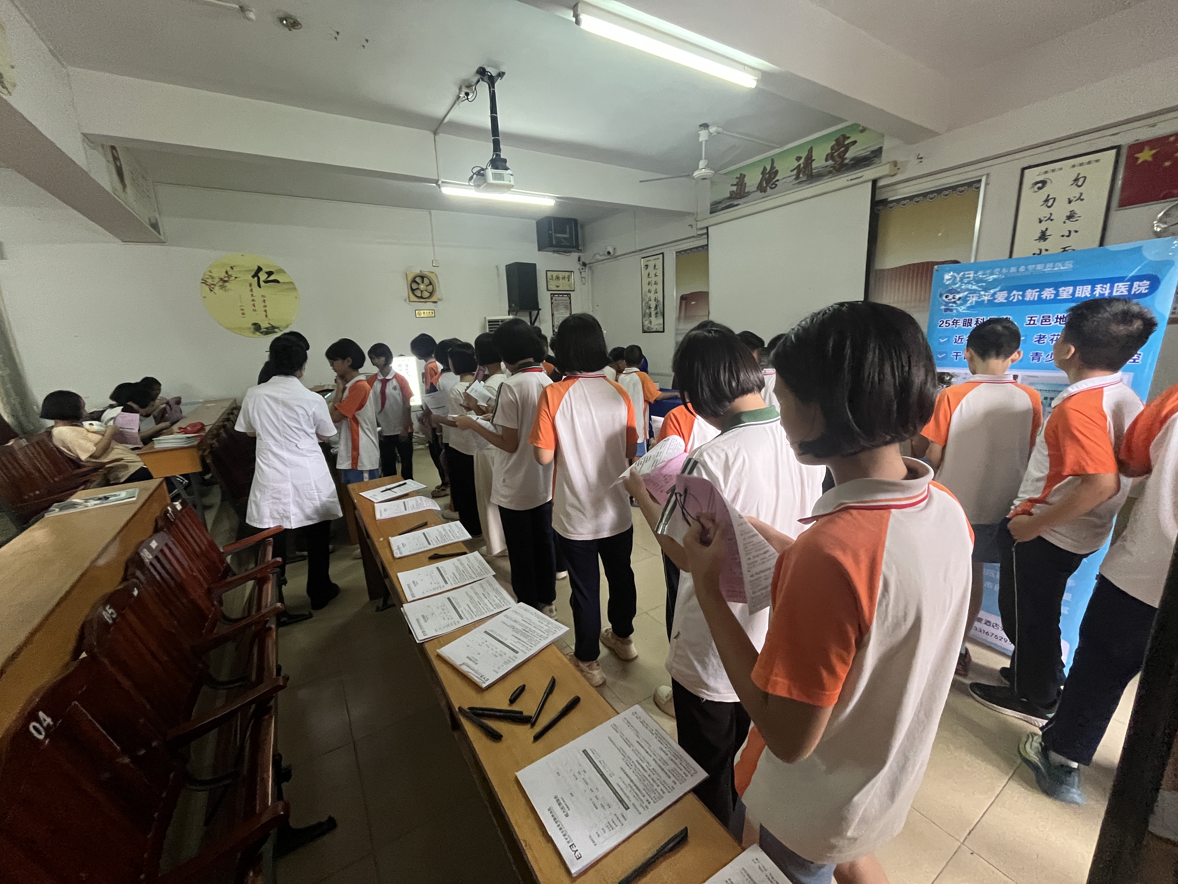 為幫助學生們深入了解近視的成因與防控方法,醫生們為師生帶來了一場系統而生動的科普講座。他們從近視的形成原因講起,逐步延伸到科學的防控策略與日常用眼規范,并結合現場演示,細致講解正確的讀寫姿勢——“眼睛離書本一尺,手離筆尖一寸,胸離書桌一拳”。清晰的口訣配上直觀的圖示,使學生們迅速掌握了保護視力的關鍵要點。此外,醫生們還耐心講解了如何控制電子設備使用時間、規范完成眼保健操等實用技巧,將專業的眼科理論轉化為易于操作的護眼指南。