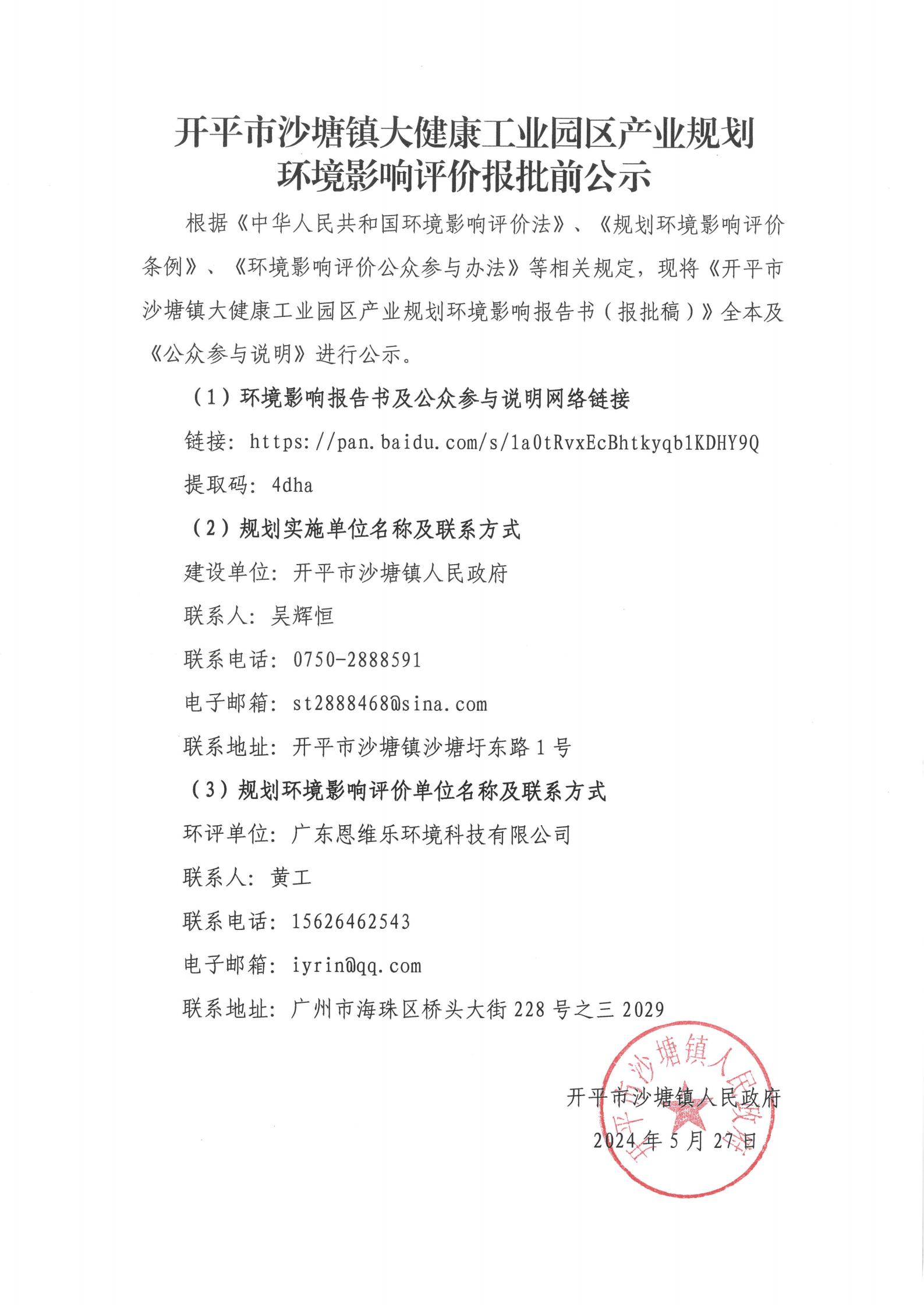 根據《中華人民共和國環境影響評價法》、《規劃環境影響評價條例》、《環境影響評價公眾參與辦法》等相關規定,現將《開平市沙塘鎮大健康工業園區產業規劃環境影響報告書(報批稿)》全本及《公眾參與說明》進行公示。