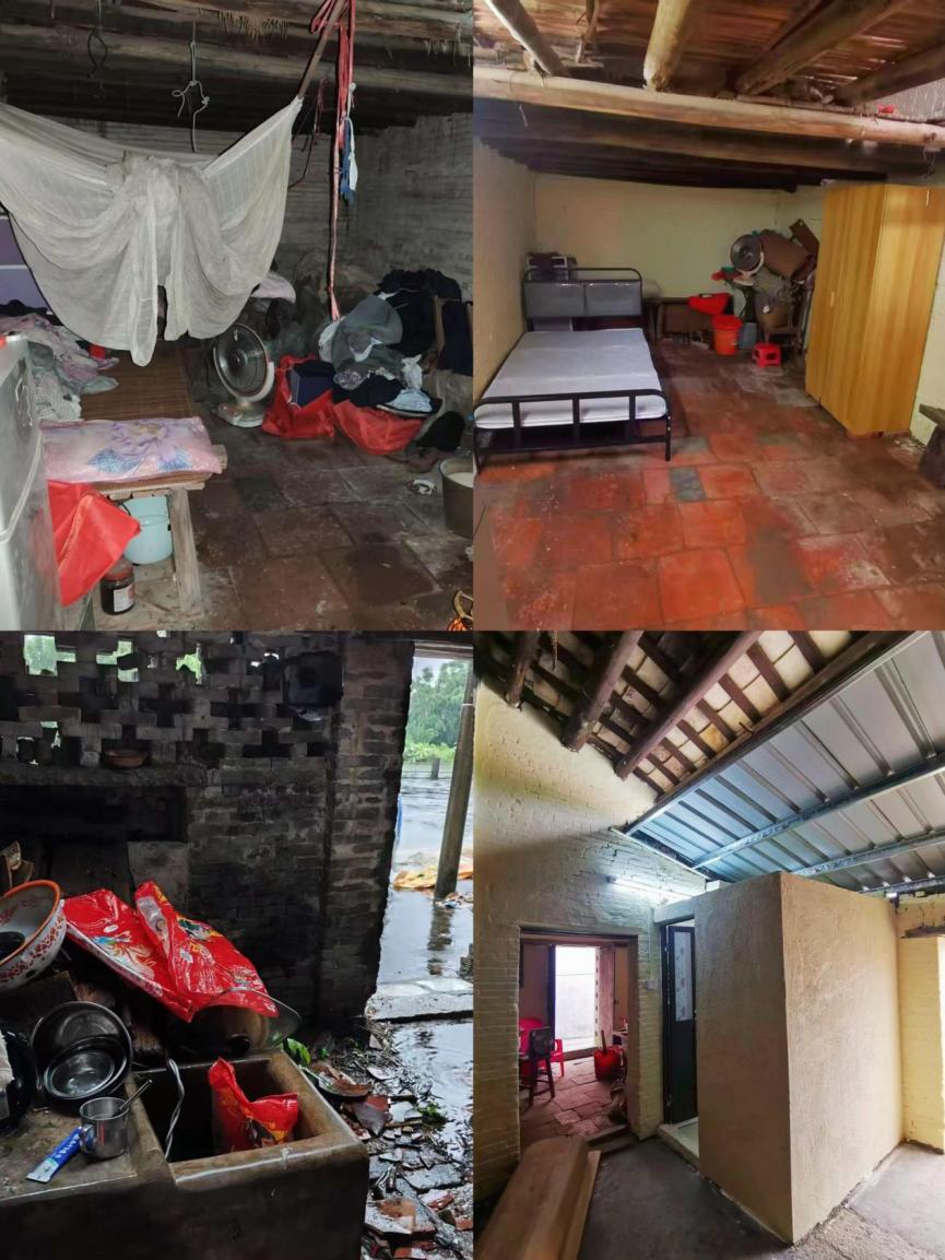 從部隊(duì)退伍回到南興村后,黃伯守著祖輩傳下的老屋過了大半輩子,無兒無女的日子里,唯有村口那座傾斜的碉樓與他作伴。可這座老屋早已扛不住歲月的敲打,一場(chǎng)突如其來的暴雨致使老房子屋頂?shù)顾冻龃翱诖蟮目吡晁嗌彻噙M(jìn)屋里,在地面砸出一個(gè)個(gè)泥坑。更讓老人犯難的是如廁問題,家里沒有衛(wèi)生間,每次都得穿過半個(gè)村子去公共廁所,遇上刮風(fēng)下雨,更是不便。作為村里的特困救助對(duì)象,他的生活開銷全靠政府補(bǔ)貼,看著屋頂?shù)钠贫春瓦b遠(yuǎn)的衛(wèi)生間,修繕房屋的念頭在心里盤桓了多年,卻總在摸了摸口袋后悄悄壓下。