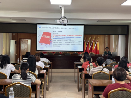 培訓班邀請了江門市理想家社會工作綜合服務中心副主任、江門市婚姻家庭關系調處專家團成員、江門市中級人民法院特邀調解員、五邑大學政法學院兼職老師黎健斌進行授課。黎老師以深入淺出的方式,為參訓干部詳細講述婦女兒童維權服務的工作依據、工作角色與工作內容,為大家理清了在工作中遇到婦女兒童合法權益受到侵害時應該怎樣干預和處理,并圍繞婚姻家庭常見糾紛類型幫助大家明確婚姻調解的工作目標,理清調解的基本思路,通過豐富詳實的案例幫助大家掌握婚姻家庭矛盾糾紛調處技巧,具有很強的指導性和實用性。